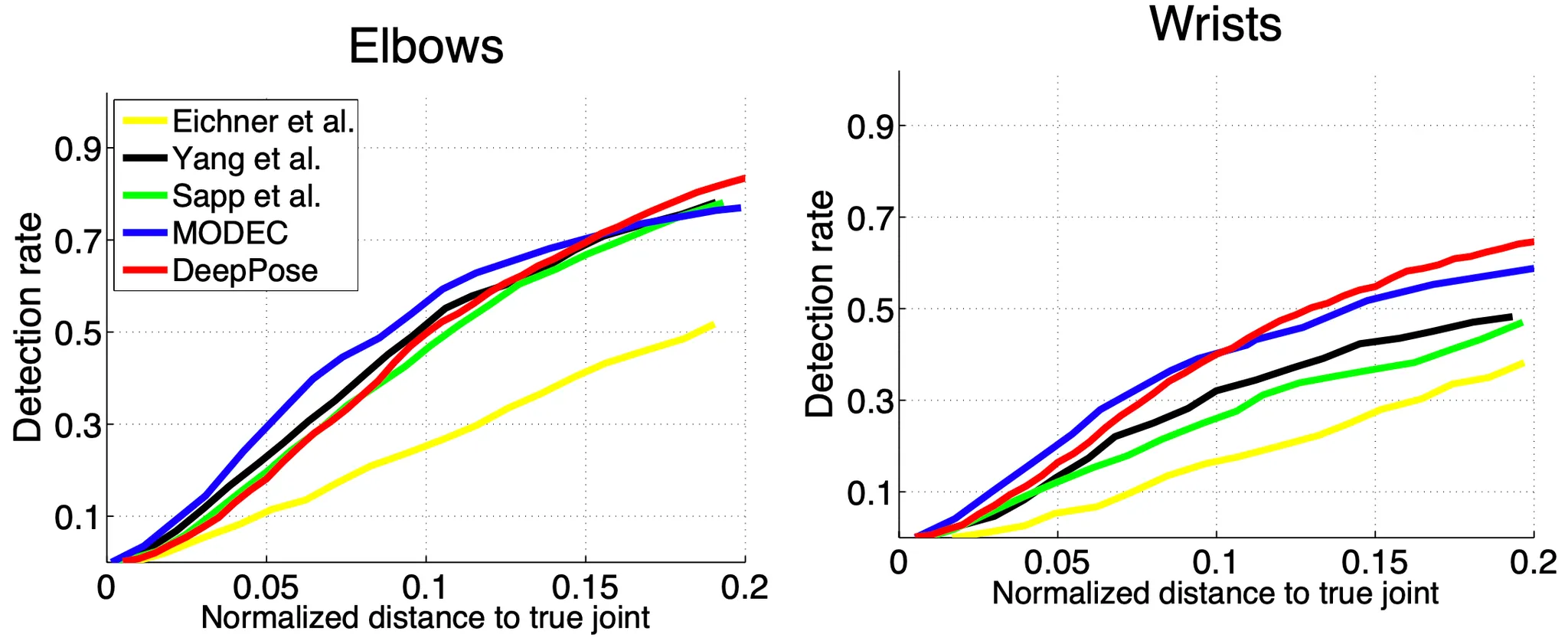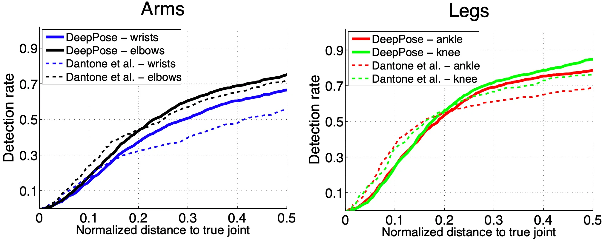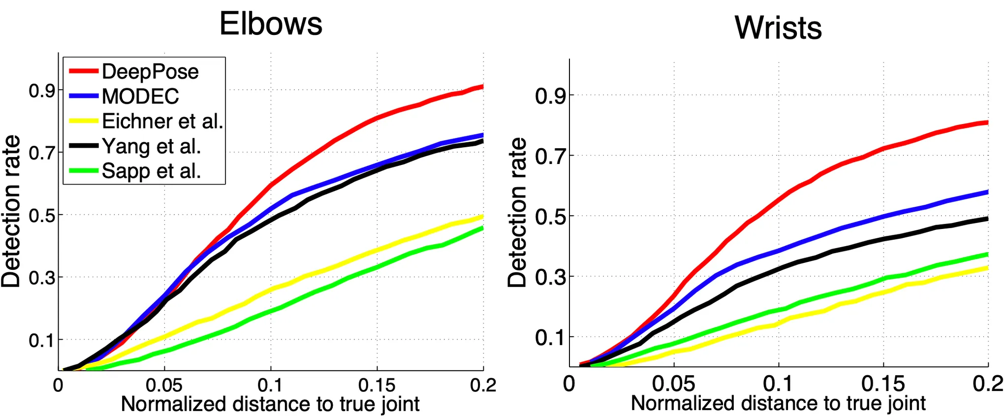 LSP dataset 에서는 전체적인 경향성으로 보면 deepPose 가 가장 높은 detection rate 를 보여주고 있는 것을 알 수 있지만, 낮은 true joint 기준선에 대해서 다른 모델에 비해 detection rate 가 떨어지는 현상을 보여줍니다. 논문에서는 이 현상을 DNN 에 포함된 max-pooling layer 의 영향으로 보고 있는데, 이 또한 자세한 설명은 생략되어 있습니다.