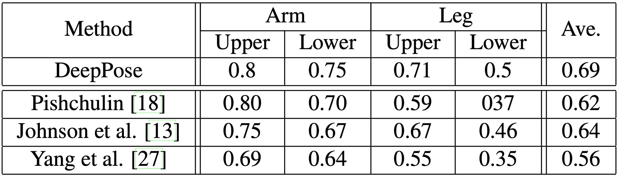 위에서 보여준 것들과 마찬가지로 DeepPose 가 모든 항목에 대해서 가장 좋은 성능을 보여줌을 알 수 있습니다. 논문에서는 이 외의 다른 것은 언급하지 않고 넘어갑니다.