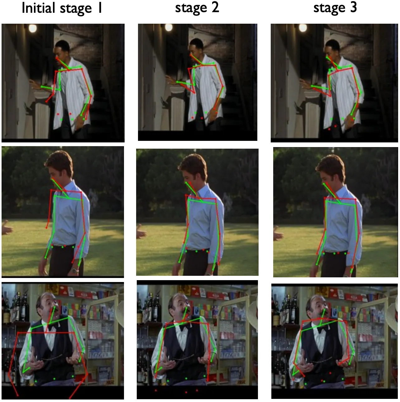 실제로, stage 에 따른 pose estimated result 의 결과를 visulaize 한 것이 위 사진입니다. Initial stage 에서 대략적으로 rough 하게 pose 를 정확하게 찾아내는 것을 볼 수 있습니다. 다만 세 번째 줄의 사진 처럼, 모양은 제대로 되었지만 scale 이 정확하지 못한 경우들이 나타났고, stage 2 를 거쳐 그것이 조정되고 더 나은 alignment 를 보여주었습니다. 더불어 적은 경우들에 한해서 첫 번째 줄의 사진 처럼 각각의 joint 자체가 미세한 조정을 통해 정확도가 높아졌다고 합니다.