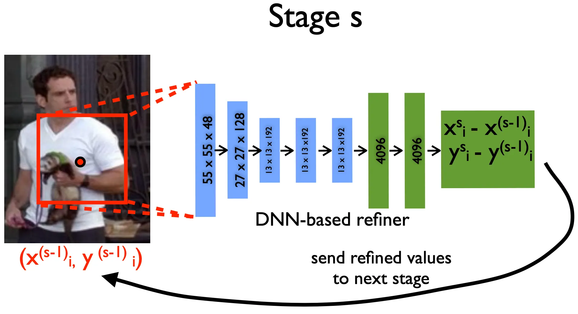 논문에서는 더 좋은 precision 을 달성하기 위해서 기존의 모델에 pose regressor 를 cascade 하여 추가로 학습을 진행하기로 합니다. Initial model 이 예측한 pose 를 refine하기 위해 추가로 regressor 를 사용하는 것입니다. 이를 위해서, cascaded pose regressor 들은 initial model 이 원하는 만큼 학습되어 initial pose 가 예측되기 전까지는 동작하지 않고 예측된 이후에 예측한 joint location 의 주변으로 image 를 crop 하여 잘려진 sub-image 위의 joint 에 대해 자세히 들여다 보면서 보정해야 할 pose displacement 를 학습합니다.