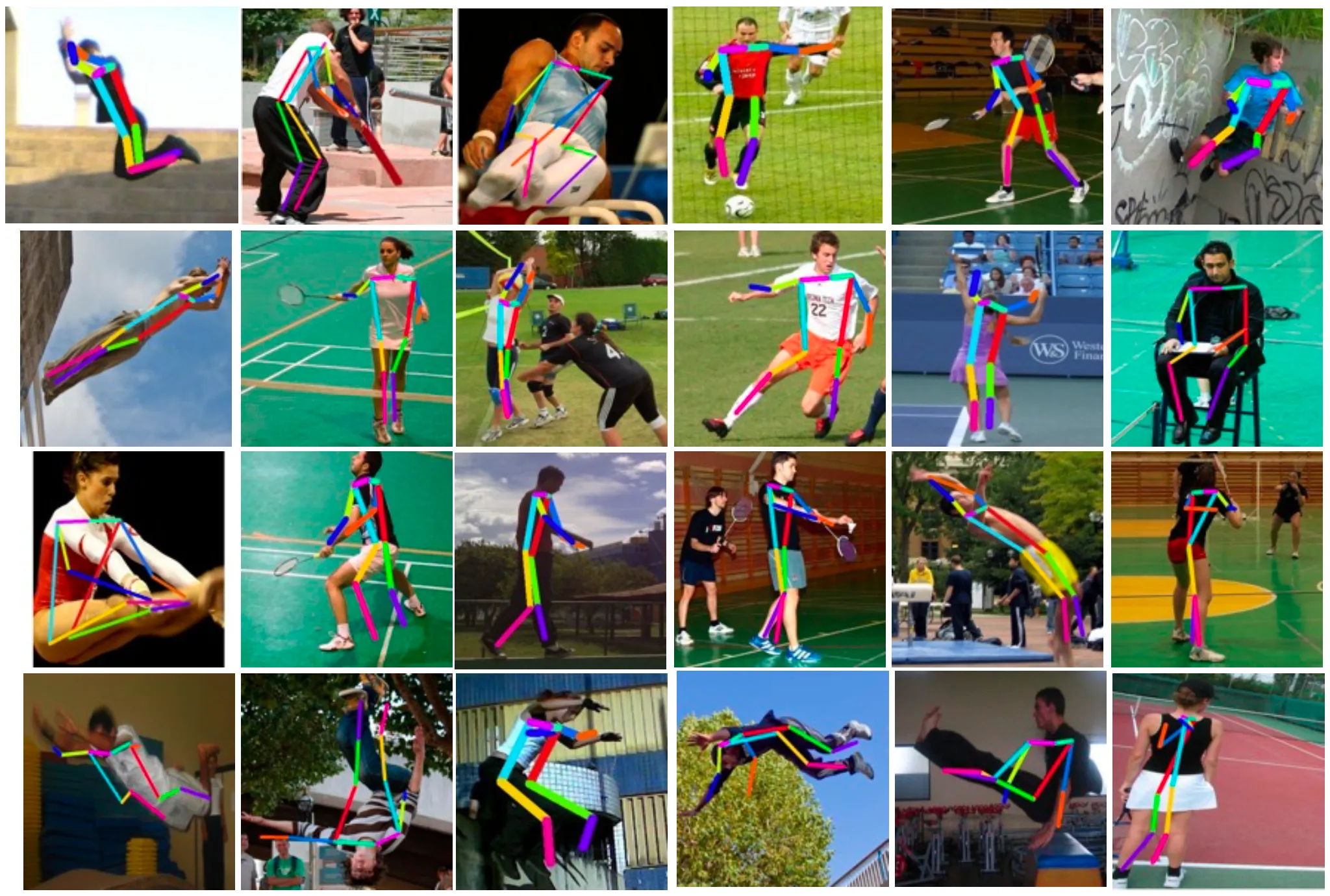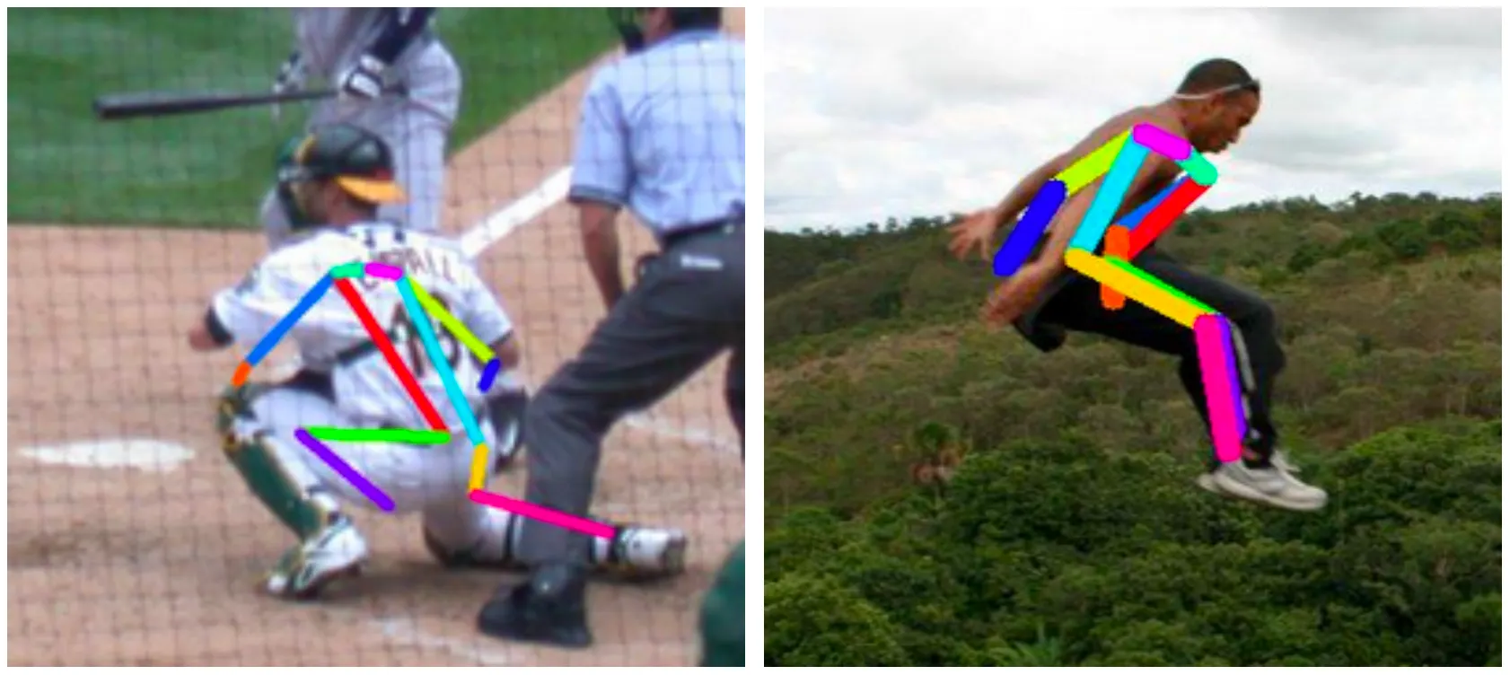 Human Pose Estimation 은 인간의 이미지로부터 그 자세를 추출해내는 과정입니다. 위의 그림의 두 사람의 내부에 그려져 있는 점과 선들로 자세를 정의해내는 것입니다. 점과 선을 그리는 기준은 인간을 구성하고 있는 관절을 기반으로 합니다. 그렇기 때문에 Human Pose Estimation 문제를 인간의 관절의 위치를 localization 하는 문제라고도 합니다.