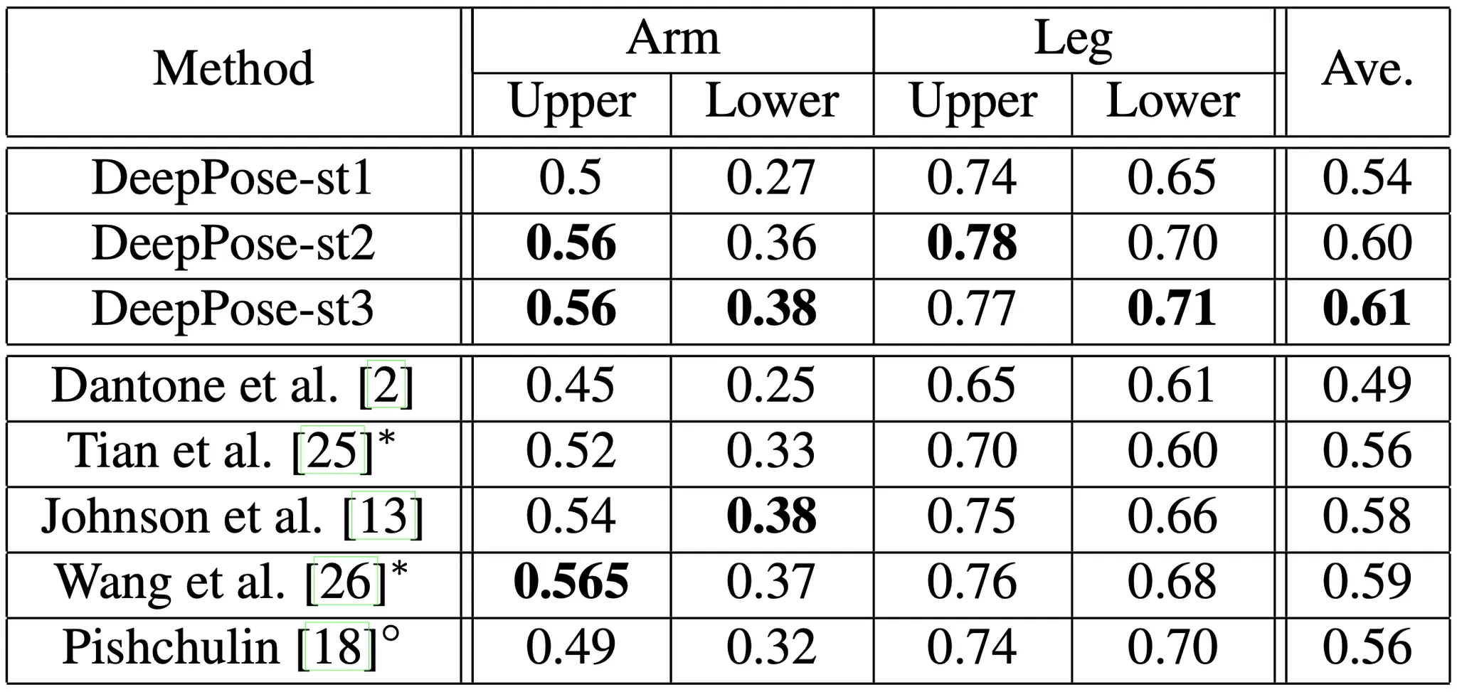 DeepPose 는 upper leg 에서 특히 좋은 성능을 보임을 알 수 있었습니다. 더불어 다른 방법론들과는 다르게 특정한 limb 에서 좋은 성능을 보이지 않고 전체적으로 높은 성능을 보이는 방법론임을 살펴볼 수 있었습니다. Average 로 본다면, DeepPose-st3 가 가장 우세함을 알 수 있습니다.