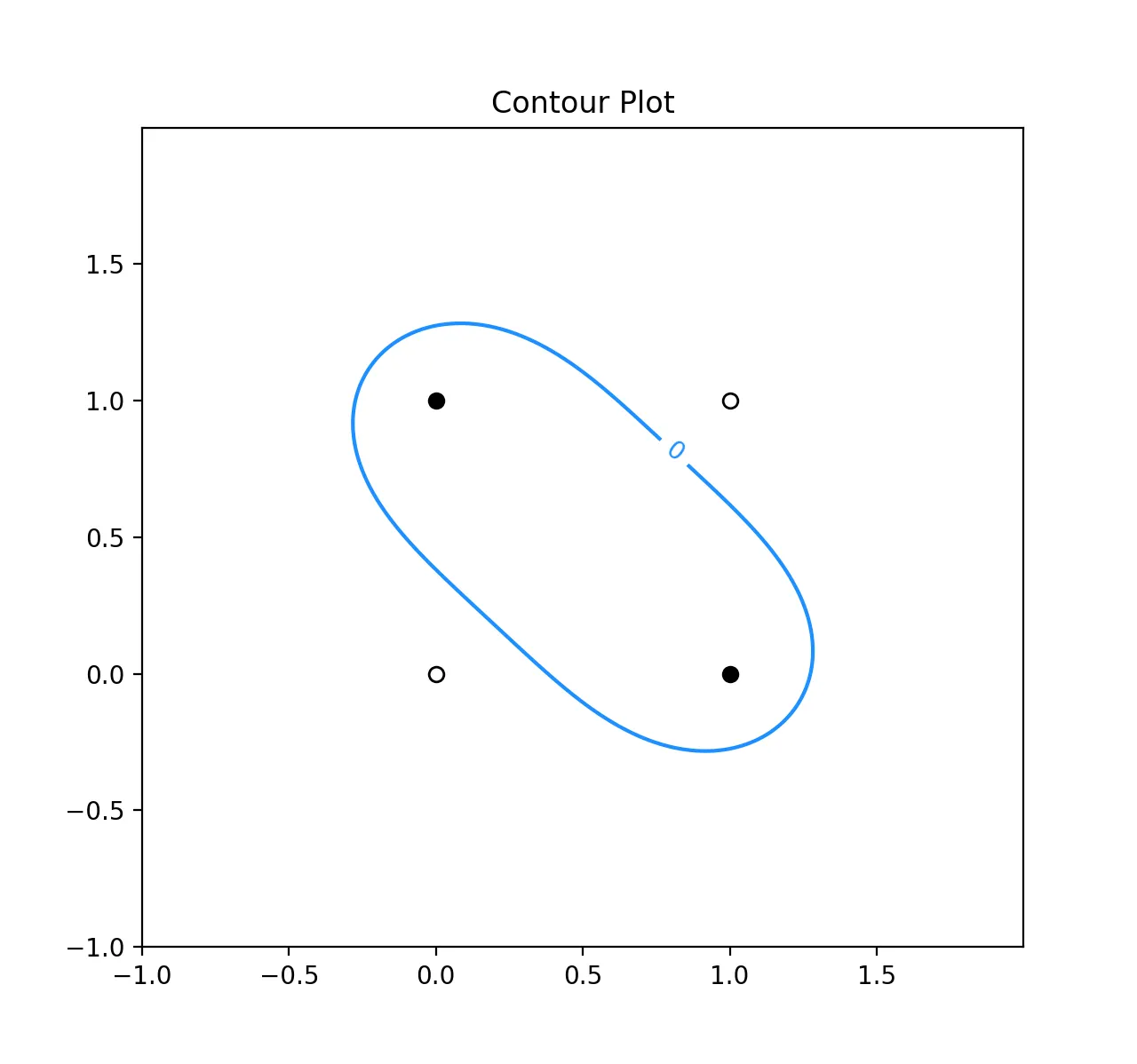 보시는 바와 같이, = 0 을 기준으로 안 쪽 범위가 0 보다 큰 범위로, 바깥 쪽 범위가 0 보다 작은 범위로 분리가 됩니다. 이 때 (0, 1), (1, 0) 은 contour 의 내부에 존재하여 1 값을, (0, 0), (1, 1) 은 contour 의 외부에 존재하여 0 값을 가지는 것을 실제로 확인할 수 있습니다.