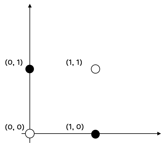 XOR 문제는 위와 같은 그래프의 점들을 색깔별로 나누는 문제였습니다. (1, 0) 과 (0, 1) 은 1 이라는 결과를 산출해야하고, (0, 0) 과 (1, 1) 은 0 이라는 결과를 산출해야만 합니다. 이를 단순히 Perceptron 으로 나누기에는 직선으로 이 둘의 경계를 정확히 구분 지을 수 없었습니다.