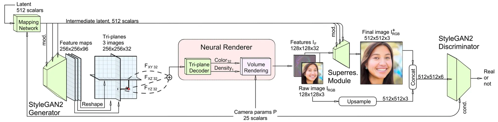 Camera Pose 를 generator 와 discriminator 에 추가적으로 넣어주는 방법으로 feature map 의 표현력이 camera pose 로 가지 않을 수 있도록 함.
