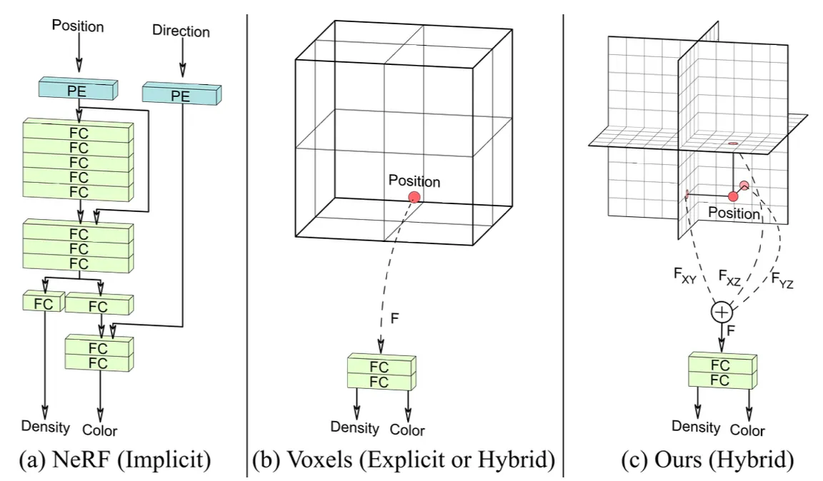 3 개의 orthogonal plane 를 정의하여 3차원 점에서 각 plane 에 projection 한 points 들의 값을 bilinear intepolation 으로 구하고 각 로 지칭함.