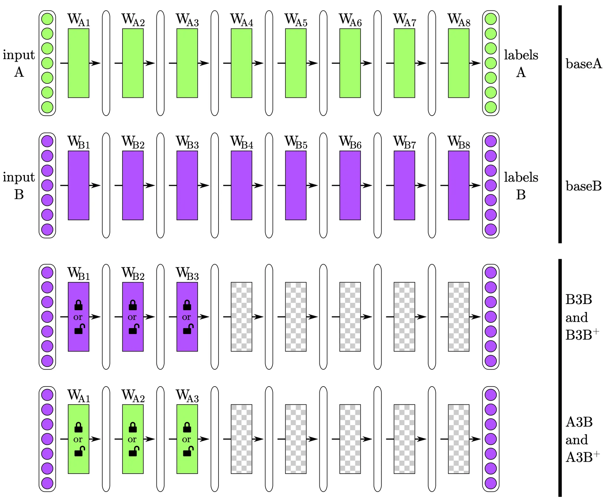 다음으로 오는 네트워크가 B3B 혹은 B3B+ 로, B3은 앞 3개의 layer 가 baseB 학습으로부터 구해진 feature 로 initialize 됨을 나타냅니다. 끝의 B 는 네트워크의 task 가 B 임을 뜻합니다. + 의 존재여부는 그림에서의 앞 3개의 trasffered layer 의 잠금 표시 유무를 나타내고, + 가 존재하는 경우 잠금이 풀리는 표시에 대응되어 transferred layer 도 학습에 포함됩니다.