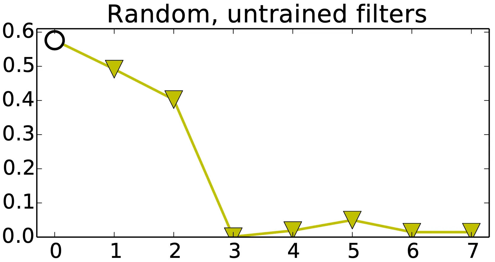 위 그림에서 비어 있는 원 라벨은 각각 위에서부터 base task 입니다. 그리고 초록색 역삼각형 라벨이 random, untrained filters 를 추가하여 진행한 task 입니다. 결과적으로, layer 1 과 layer 2 에서 performance 가 급격하게 저하되었고, layer 3 이후부터 거의 0 에 가까운 accuracy 를 보여주었습니다. 이 결과를 통해서 random weight 를 CNN 에 적용하는 것은 Jarrett et al. 에서처럼 적은 network size 와 적은 dataset 에 적용하는 것보다 성능에 있어서 효과적이지 못함을 알 수 있었습니다.