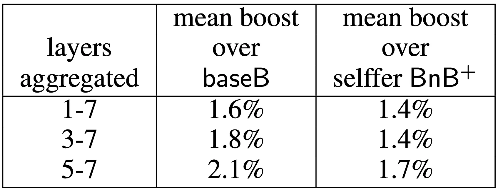 그럴듯한 설명으로는 fine-tuning 을 진행하는 iteration 동안 base dataset 에서 가지고 있었던 효과(결과적으로는 dataset B 로만은 학습할 수 없는, 더 일반성에 기여할 수 있는 방향으로의 효과로 보고 있습니다.)가 어떠한 형태로든 영향을 주어 generalization performance 에 기여하지 않았을까라고 보고 있으며, 이 설명이 맞다면 수 많은 iteration 을 거쳐서도 남아있다는 것은 놀라운 결과였습니다. 아래의 결과는 집계된 layer 별 top-1 accuracy 의 boosting 정도를 나타내는 표입니다.