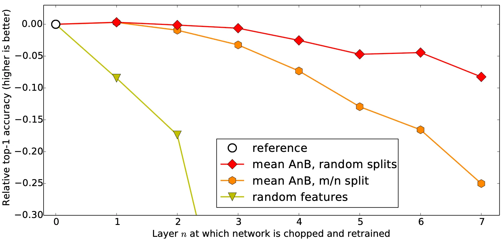 붉은색 원 라벨인 AnB 의 경우가 실제로 논문에서 보고 싶었던 한 network 에서 다른 network 로의 transfer ability 를 보여줍니다. Layer 1 과 layer 2 까지의 transfer 는 거의 완벽하게 성능이 보존되었고, 다른 task 임에도 불구하고 첫 두 layer 까지 Gabor features 와 color blobs 등을 general 하게 가짐을 실험적으로 보여주었습니다. Layer 3 부터는 서서히 성능이 감소하기 시작하는데, 이는 푸른색 원 라벨 BnB 에서 본 결과처럼 co-adapted 된 feature 의 영향과 specific 한 feature 의 영향(뒤 쪽의 layer 까지 general 한 layer 로 간주하고 initialize 를 했기 때문)을 합쳐진 결과로 볼 수 있었습니다. 때문에 BnB 에서보다 더 성능의 저하가 클 수 밖에 없었던 것으로 보고 있습니다. Layer 6 과 layer 7 에서는 co-adapted 된 feature 의 영향이 전혀 사라지고 specific 한 feature 의 영향만이 남아 performance 가 급격하게 감소한 것입니다.