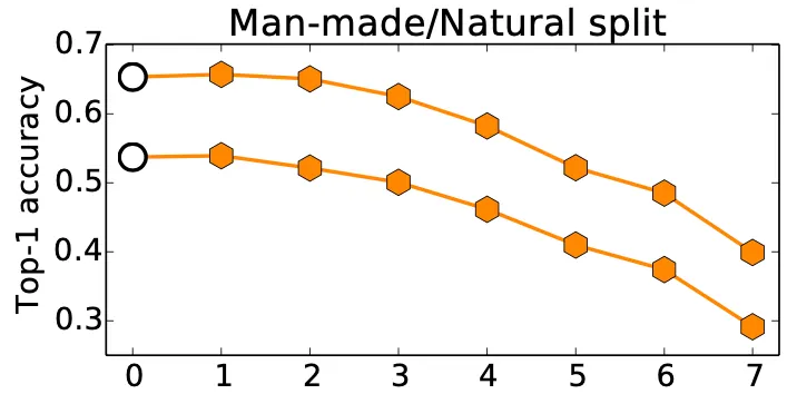 위 그림에서 비어 있는 원 라벨은 각각 위에서부터 base A (Natural), base B (Man-made) 이며 주황색 육각형 라벨은 각각 BnA, AnB 입니다. Natural classes 의 경우 class 가 449 개, Man-made classes 의 경우 class 가 551 개이기 때문에 상대적으로 class 의 수가 적은 natural classes dataset 으로 학습을 진행한 base A 의 top-1 accuracy 가 높은 것을 볼 수 있었습니다.