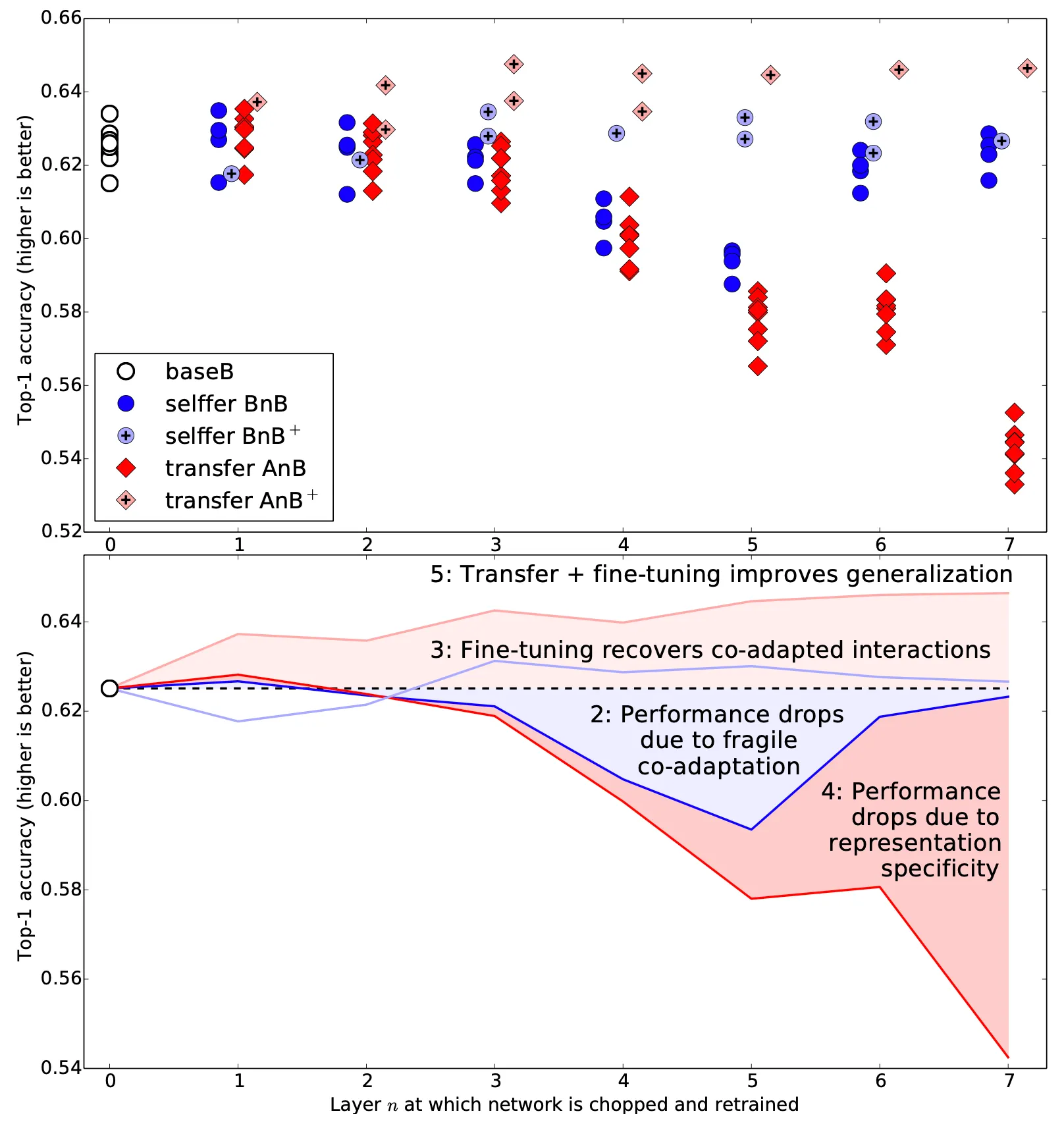 푸른색 원 라벨인 BnB 의 경우 상당히 의심스러운 양상을 보였습니다. 어느 정도 예상했듯이, layer 1 과 layer 2 의 초기 layer 에 대해서는 base B 로 부터 큰 차이를 보이지 않았습니다. 이는 layer 1 과 layer 2 에서 보이는 feature 들이 앞서 설명한 Gabor features 와 color blobs 등을 학습했기 때문입니다. 실제로 이들을 고정하고 다른 feature 를 retrain 하면 원래의 성능이 나오게 됩니다. 하지만, layer 3, 4, 5, 그리고 6 까지 transfer 를 한 결과 성능이 눈에 띄게 감소했습니다. 이러한 성능의 감소는 기존의 성공적이었던 base 네트워크가 깨지기 쉬운 co-adapted features 를 가지고 있었기 때문입니다.