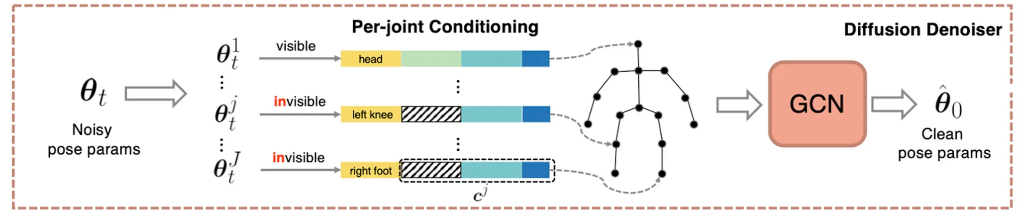 위 그림과 같이 각각의 SMPL pose parameter 에 대해서 noise 를 추가한 뒤에, Per-Joint Conditioning 을 할당하여 Graph 를 완성한 뒤, GCN 을 통과시켜 denoised 된 pose parameter 를 예측하도록 하는 구조입니다. 기본적인 Diffusion Model 과 동일하게 sampling 된 timestep 에 대해서 이와 같이 학습을 진행한다고 볼 수 있습니다.