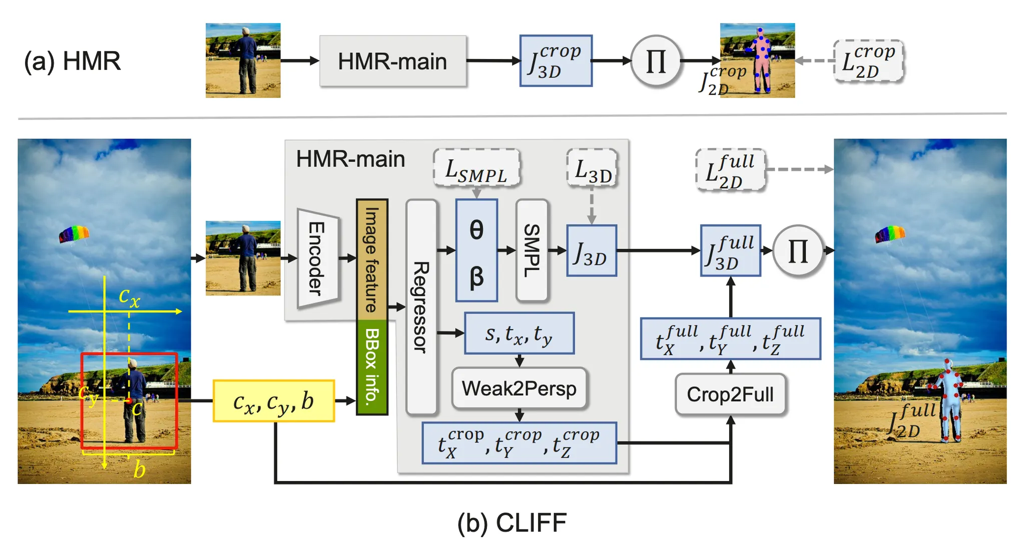 CLIFF 논문에서는 전체 이미지에서 human 의 위치 정보가 3D Human Pose 와 Shape Estimation 에 영향을 줄 수 있음을 시사하면서 Global Location Aware Information 의 부재가 SMPL 의 pose parameter 를 예측하는데 어려움을 줄 수 있다고 이야기 합니다.