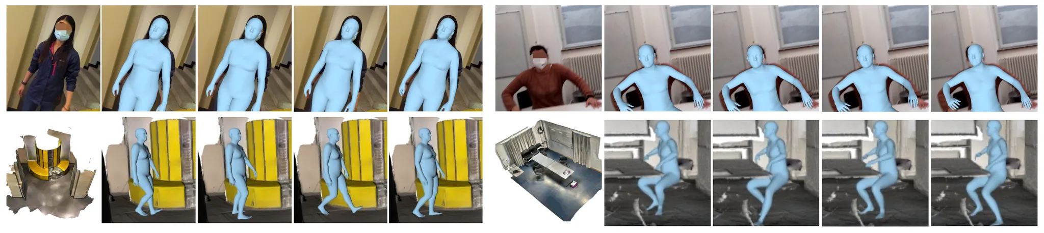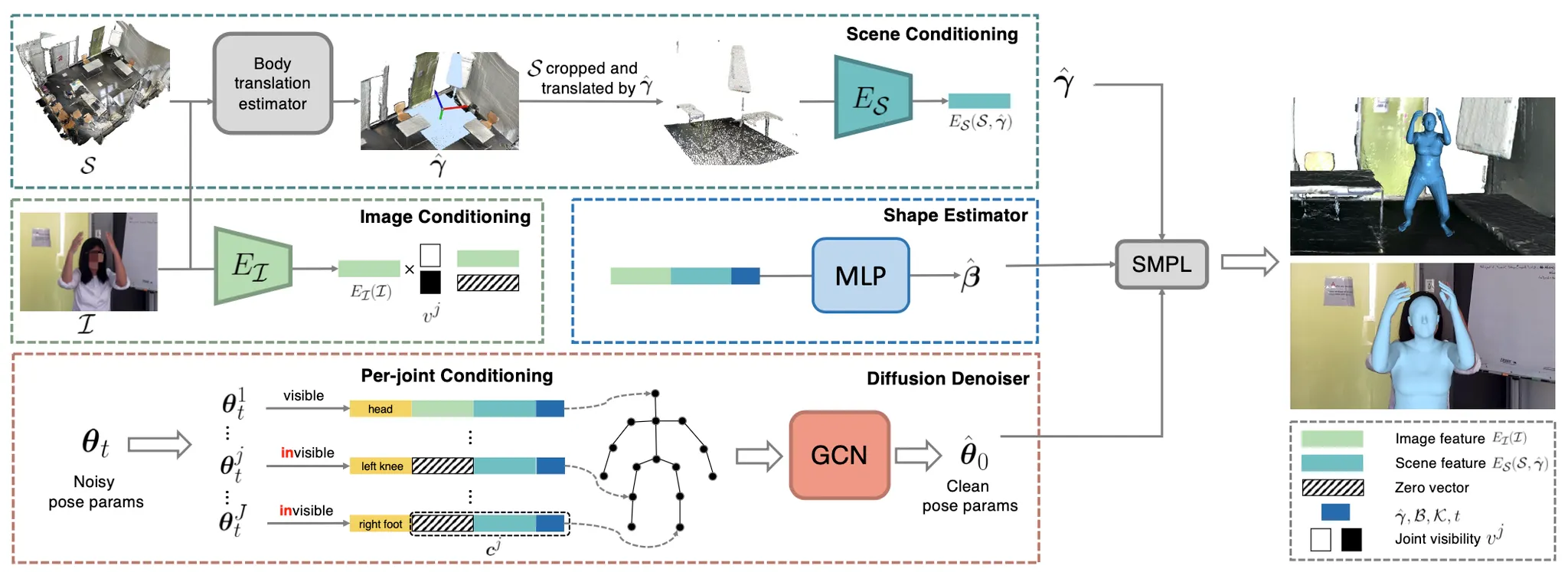 이러한 시나리오에서는 FrankMocap 과 같이 단일 이미지에서 Human Mesh 를 뽑아내는 연구들과는 달리, 인간의 신체가 가려져 있음에도 그럴듯한 Human Mesh 를 복원해야 합니다. 때문에 논문에서는 인간이 점유하고 있는 공간 주변의 3D Scene 이 자세에 대한 정보를 포함하고 있음에 착안하여 이를 활용해 Human Pose 에 대한 확률 분포를 학습하는 것으로 자연스럽고, 그럴듯한 다양한 자세를 만들어내는 시도를 합니다.