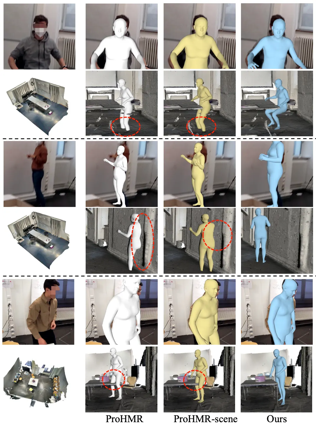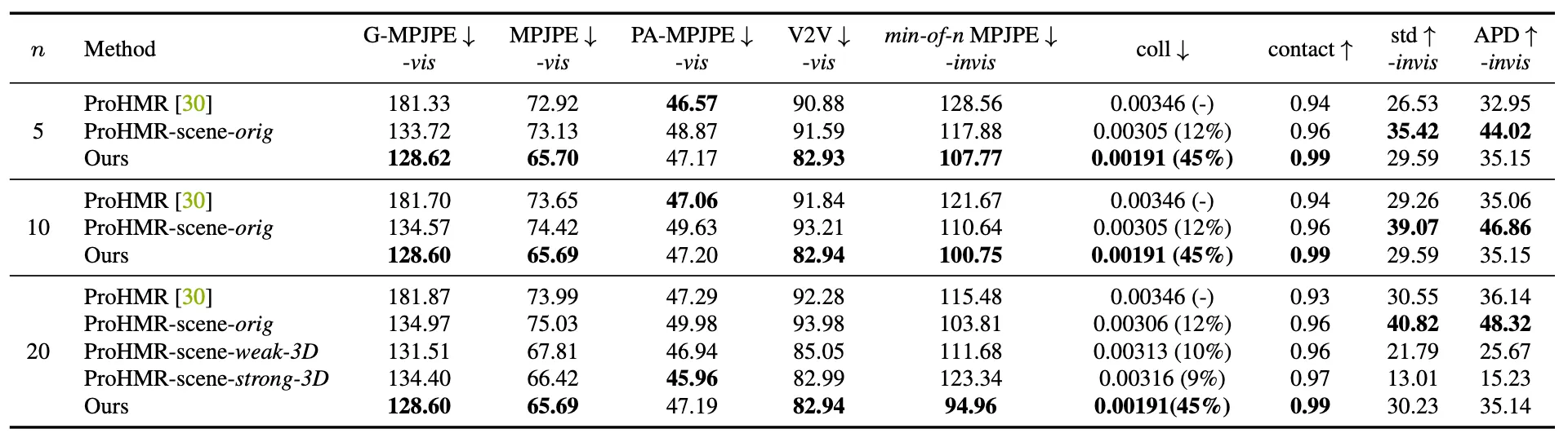 또한 논문에서는 다른 방법론들보다 contact ratio 가 높았는데, 실제로 ProHMR 에 비하면 collision 이 45% 가 줄었고, ProHMR-scene 에 비하면 collision 이 37% 정도가 줄었습니다. 이는 신체와 3D 환경과의 더 나은 관계성을 구현했다고 볼 수 있었습니다.