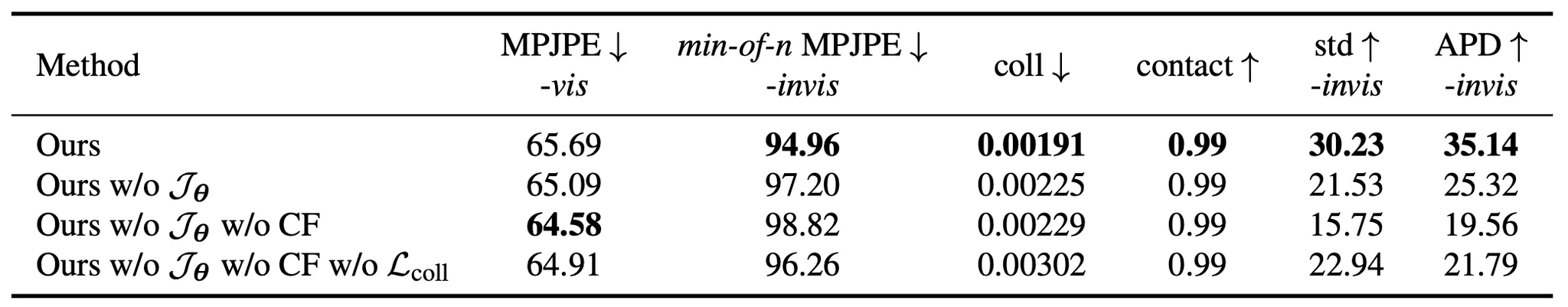 위 표에 따르면, 논문에서 제시한 collision score based sampling 과정에 포함되는 과 collision loss 가 모두 coliision 발생을 유의미하게 줄였음을 확인할 수 있었습니다. 또한 Classifier-Free-Guidance 의 사용으로 invisible point 에 대한 예측은 unconditional 하게 진행한 것이 diversity 에 큰 도움이 되었다는 것을 확인할 수 있었습니다.
