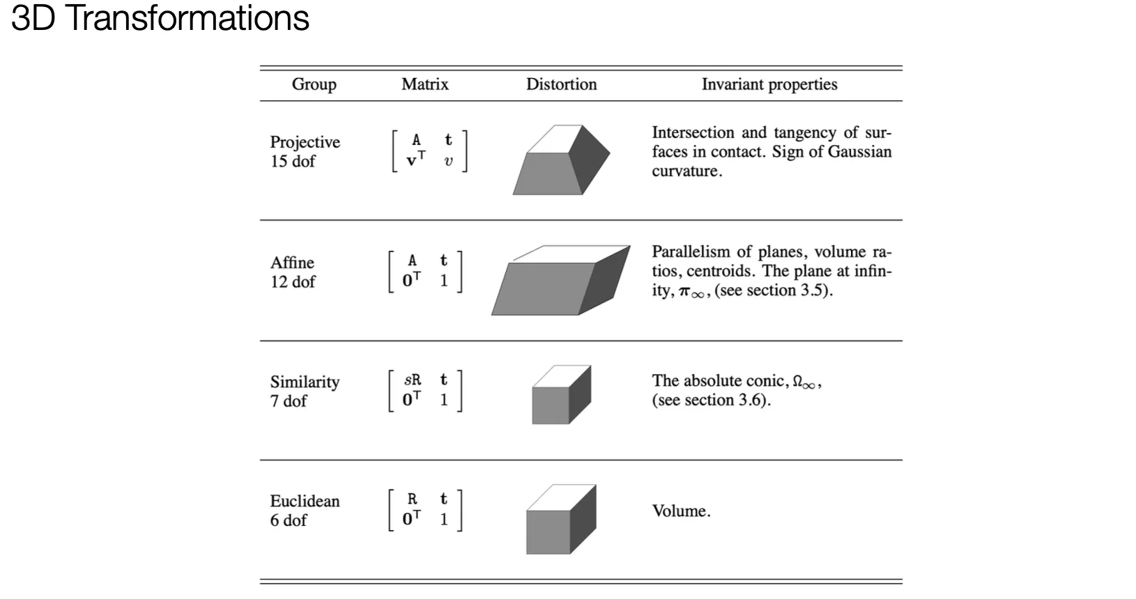 A Hierarchy of Transformations in 3D