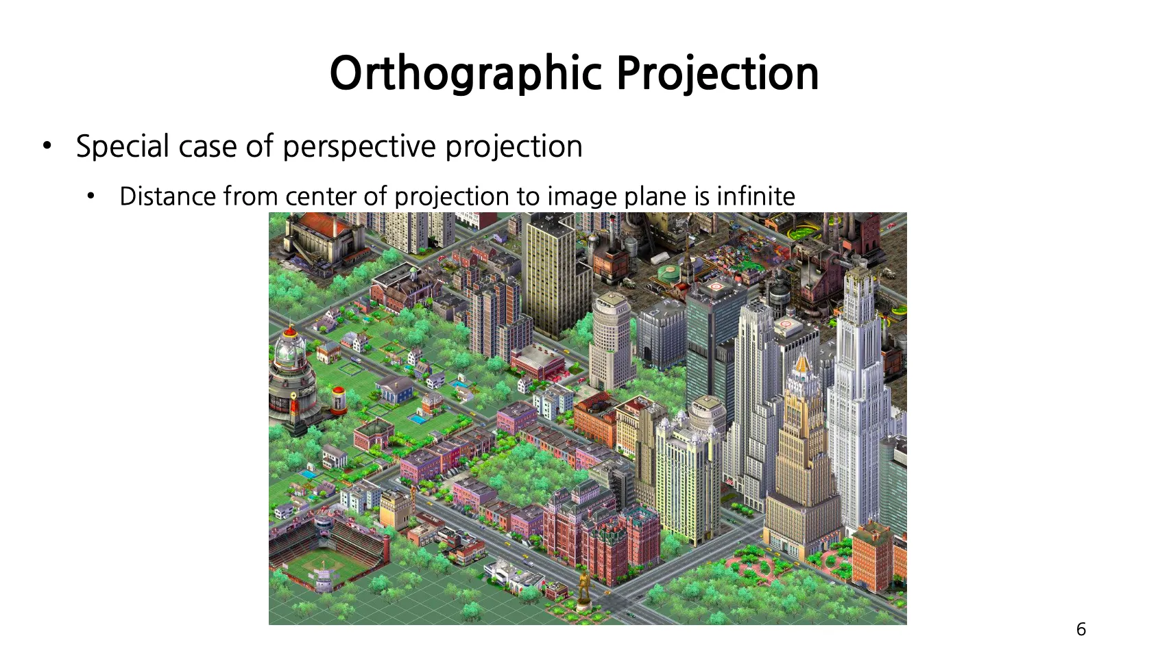Sim City 같은 게임을 할 때 앞 건물이 뒷 건물보다 커야하는데, 게임하기 편하기 위해서 이를 고려하지 않고 비율이 같음 (Perspective Effect 를 무시함)