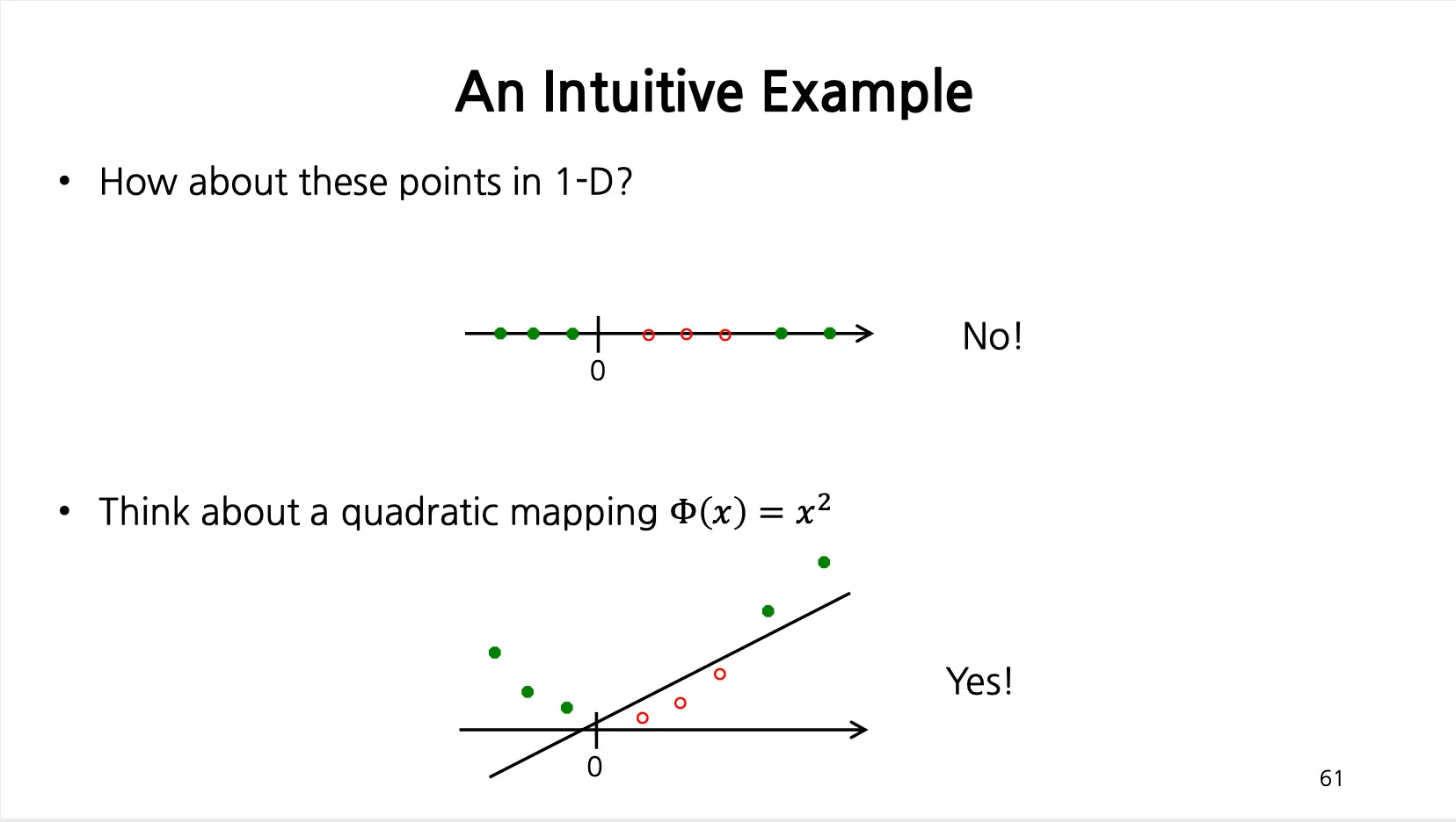 다음과 같이 1-D 데이터를 quadratic mapping 을 하면 직선으로 나눌 수 있음.