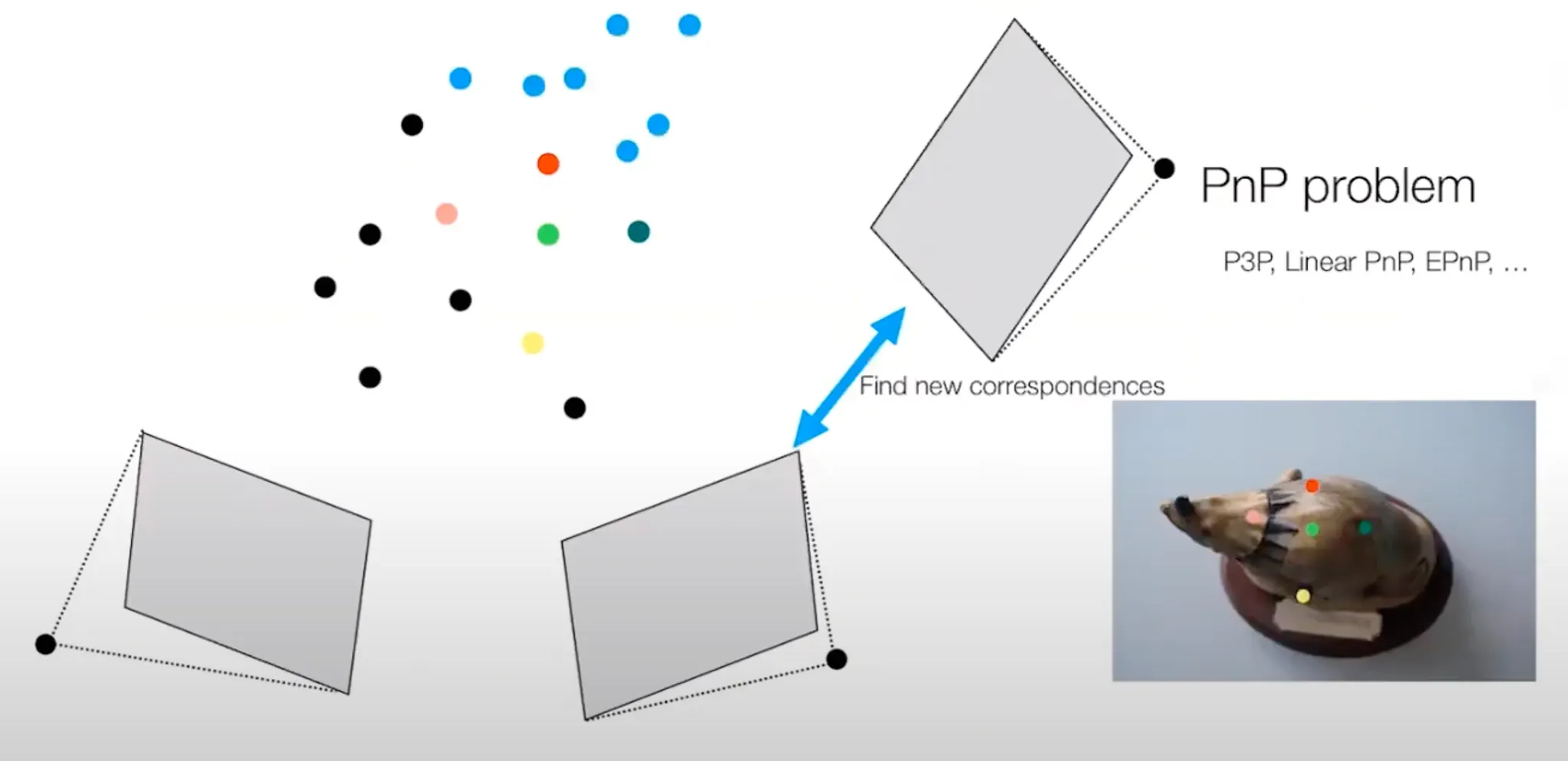 3D - 2D correspondence 를 바탕으로 PnP 방법론을 적용하면 세 번째 Image 의 Camera Pose 를 얻어낼 수 있음. 이 때, P3P 를 사용한다고 하면 임의의 세 점을 선택하여 Camera Matrix 를 구해보고 reprojection error 를 구하는 것을 반복하여 outlier 가 가장 적은 세 점의 세팅을 찾고 해당 세팅에서 outlier 를 제거한 채 남은 점들로 PnP 를 사용해 최종 를 구하게 됨.