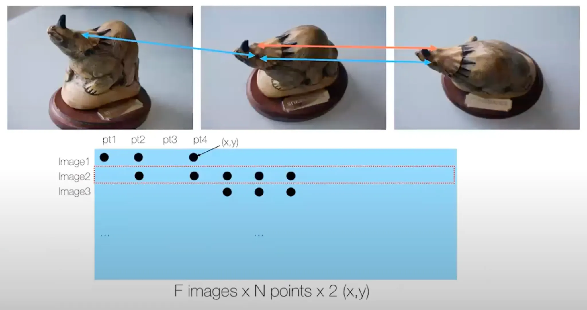 이후, 각 이미지에서 Corresponding Points 를 찾은 뒤, 동일한 점을 나타내는 이미지의 픽셀값들을 같은 열이 되도록 위와 같이 구성할 수 있음.