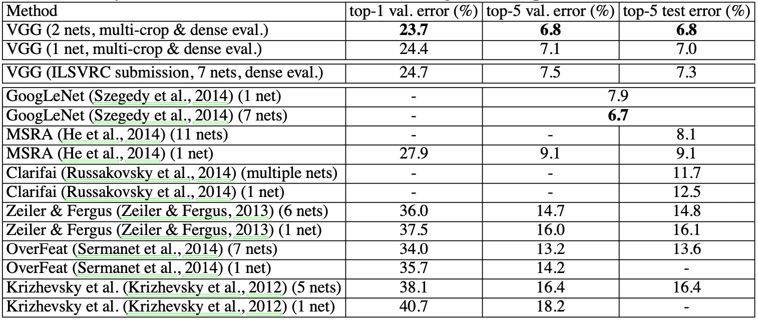 마지막으로, 논문에서는 State of the Art 연구들과 VGGNet 의 성능을 ILSVRC-2014 dataset 에 대해서 비교해줍니다.