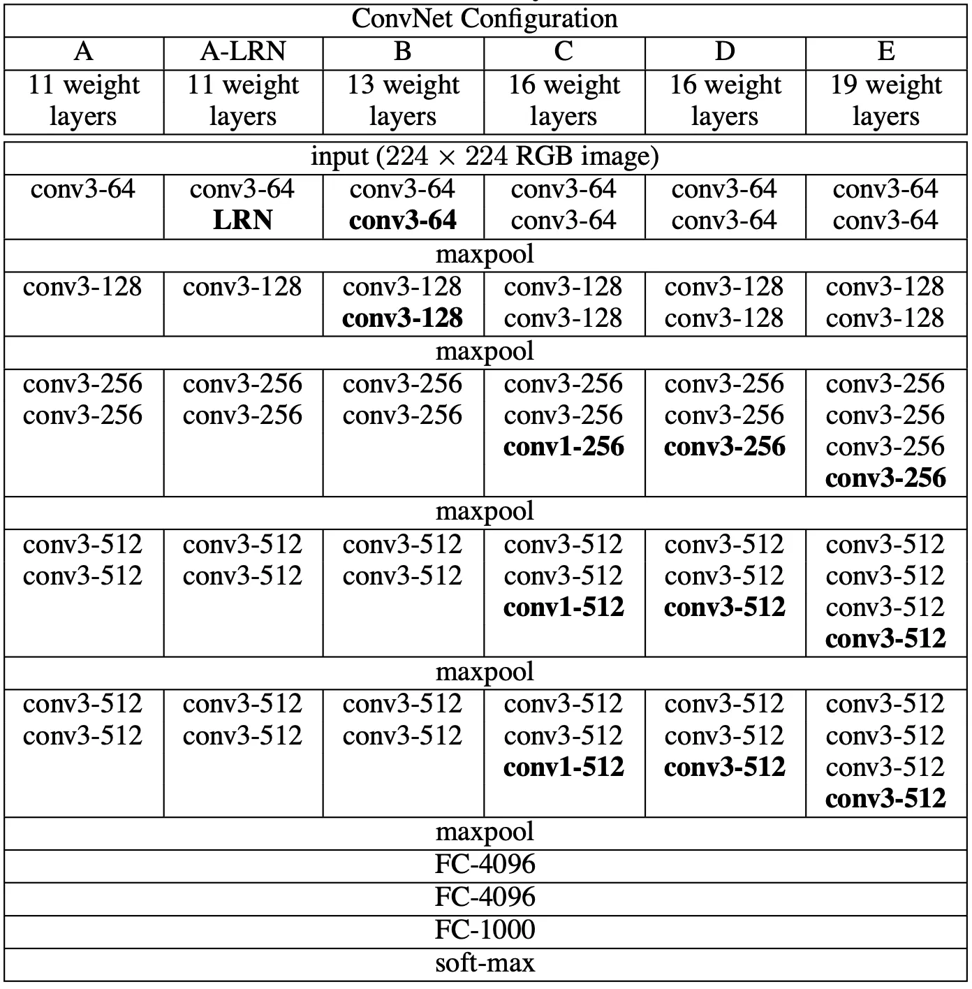 위의 도식표를 보시면 아시겠지만, 각각의 A~E 까지의 Convolution Network 의 depth 가 각기 다릅니다. 자세히 들여다 보시면, Convolution Layer 의 channel 수가 64 부터 시작하여 512 가 될 때까지 2배씩 증가하는 것을 보실 수 있습니다. 더욱이, 각각의 Convolutional Network 가 가진 학습 parameter 의 수 또한 상이합니다.