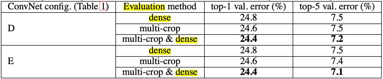 다음으로 보여주는 것이 testing 부분에서 말씀 드렸던 dense evaluation 과 multi-crop evaluation 을 각각 적용해보고 얻은 성능에 대한 내용입니다. 결과는 아래의 표에 나타난 것과 같습니다.