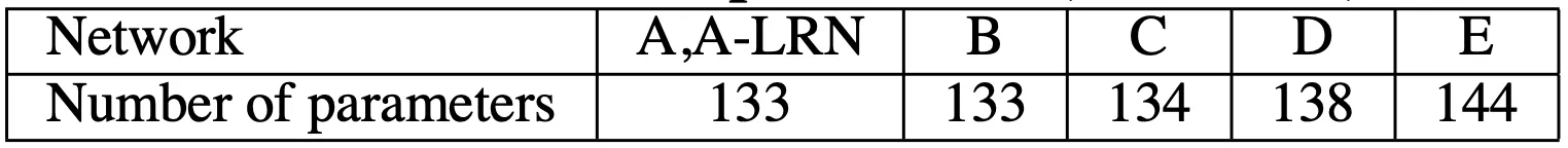 가장 먼저 보이는 것은 Local Response Network 가 성능을 개선하지 못했다는 점입니다. A 와 A-LRN 의 metric 차이가 거의 없으며, 이 때문에 논문에서는 B~E 에서 LRN Layer 를 넣지 않았다고 합니다.