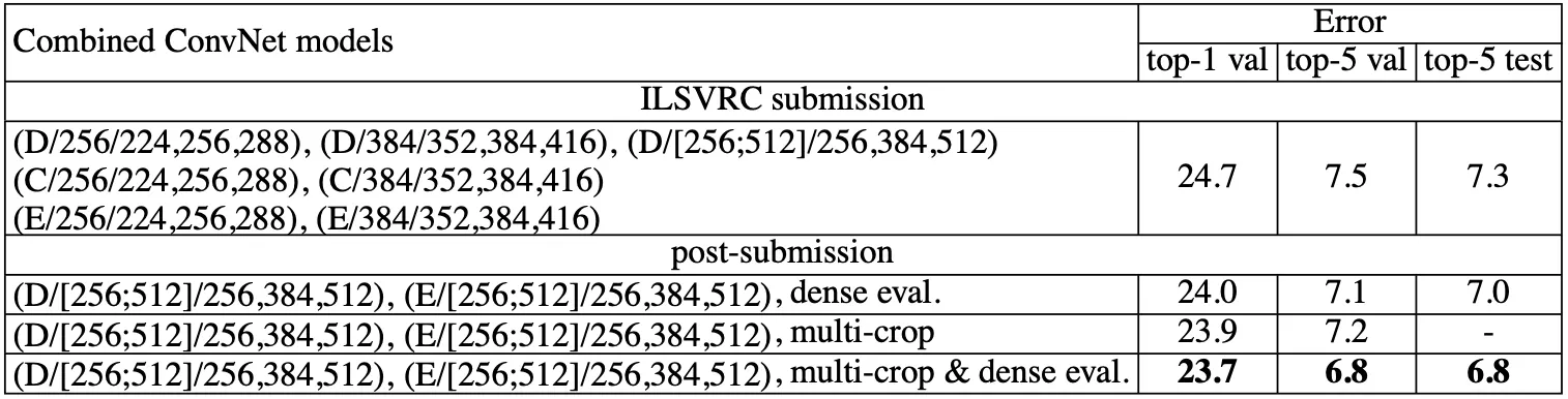 이후 ILSVRC submission 이후에 가장 좋았던 D 와 E 를 각각의 evaluation method 에 맞게 두 개씩 합친 결과를 산출해보니 top-5 error 를 6.8% 까지 줄일 수 있었다고 합니다.