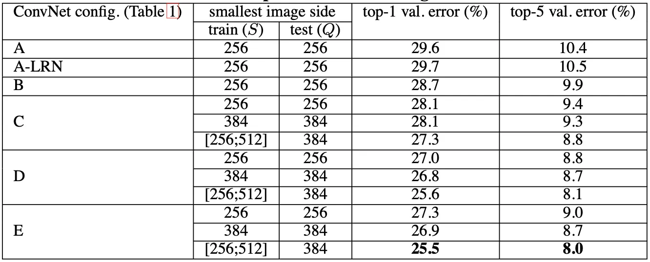 또한 위 표에는 나와있지 않지만, B 에서 33 recpetive field filter 2 개가 연달아 있는 구조를 55 recpetive field filter 로 바꾸어 성능을 비교해 보았는데, 바꾼 후에 top-1 error 가 7% 정도 상승했다고 합니다. 이를 통해 깊고 작은 Convolutional Layer 를 쓰는 것이 얕고 큰 Convolutional Layer 를 쓰는 것보다 좋은 성능을 보임을 알 수 있었습니다.