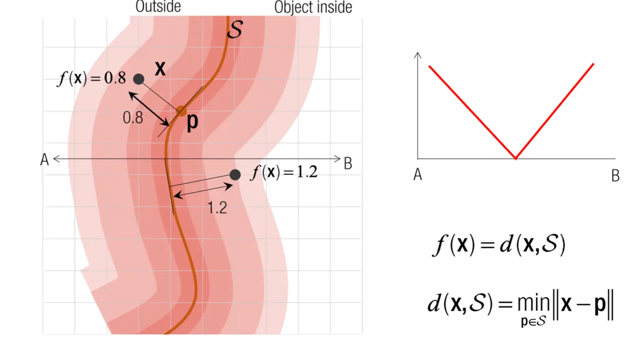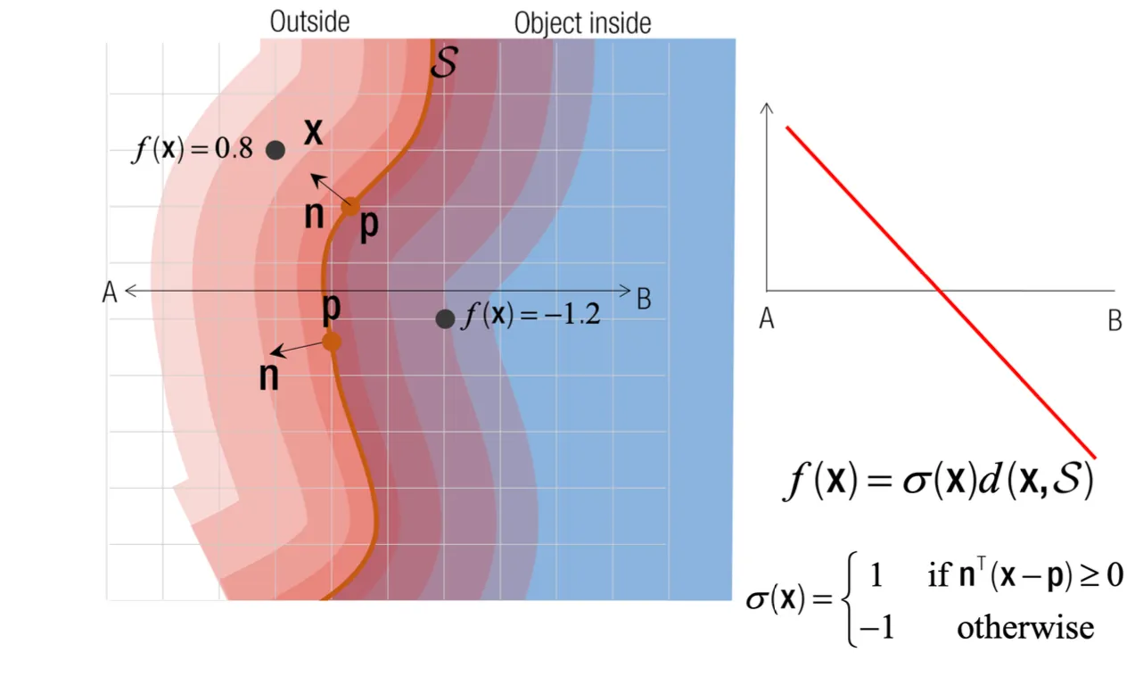 Distance Field 와 다르게 가지는 Signed Distance Field 의 장점은 surface (값이 0 인 지점) 가 양수인 지점과 음수인 지점 사이에 존재한다는 직관이 있다는 것임.