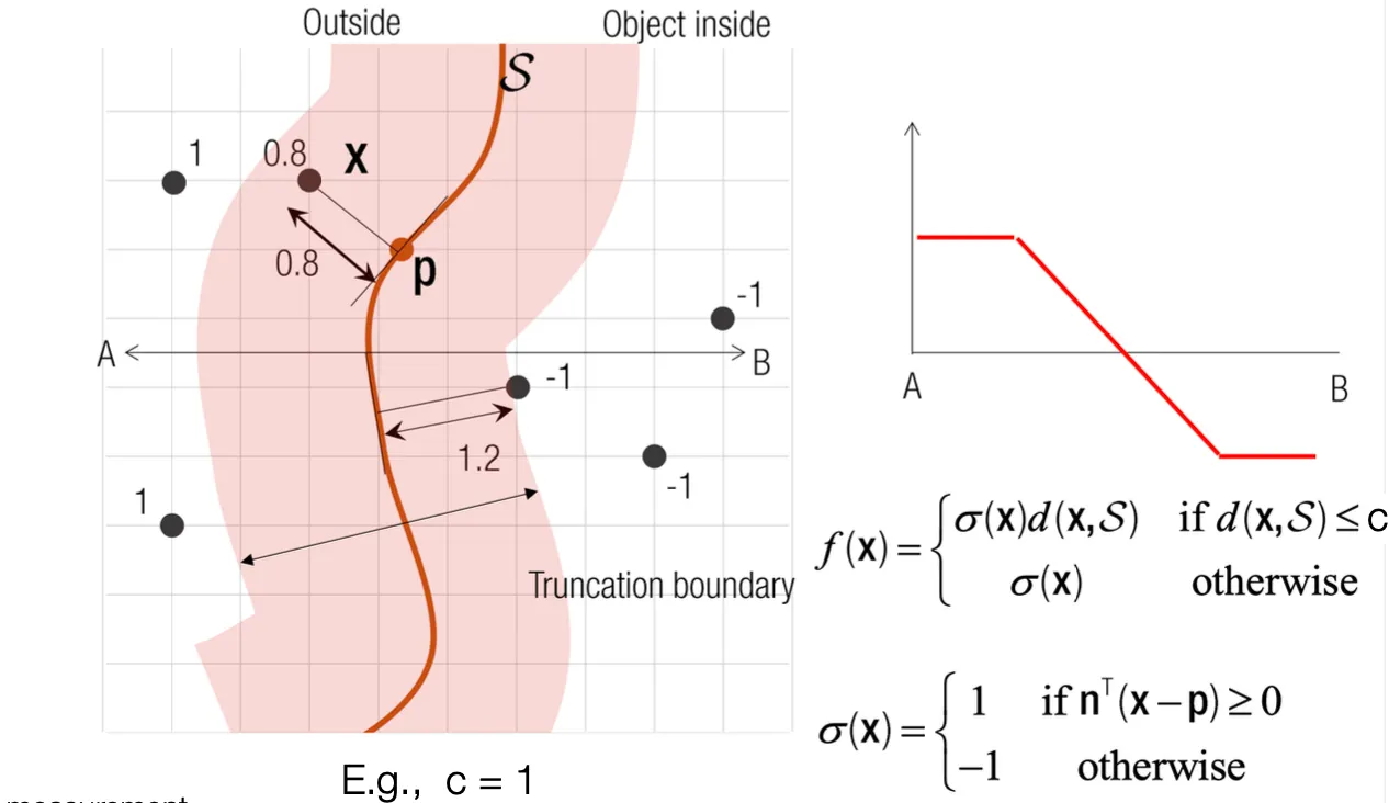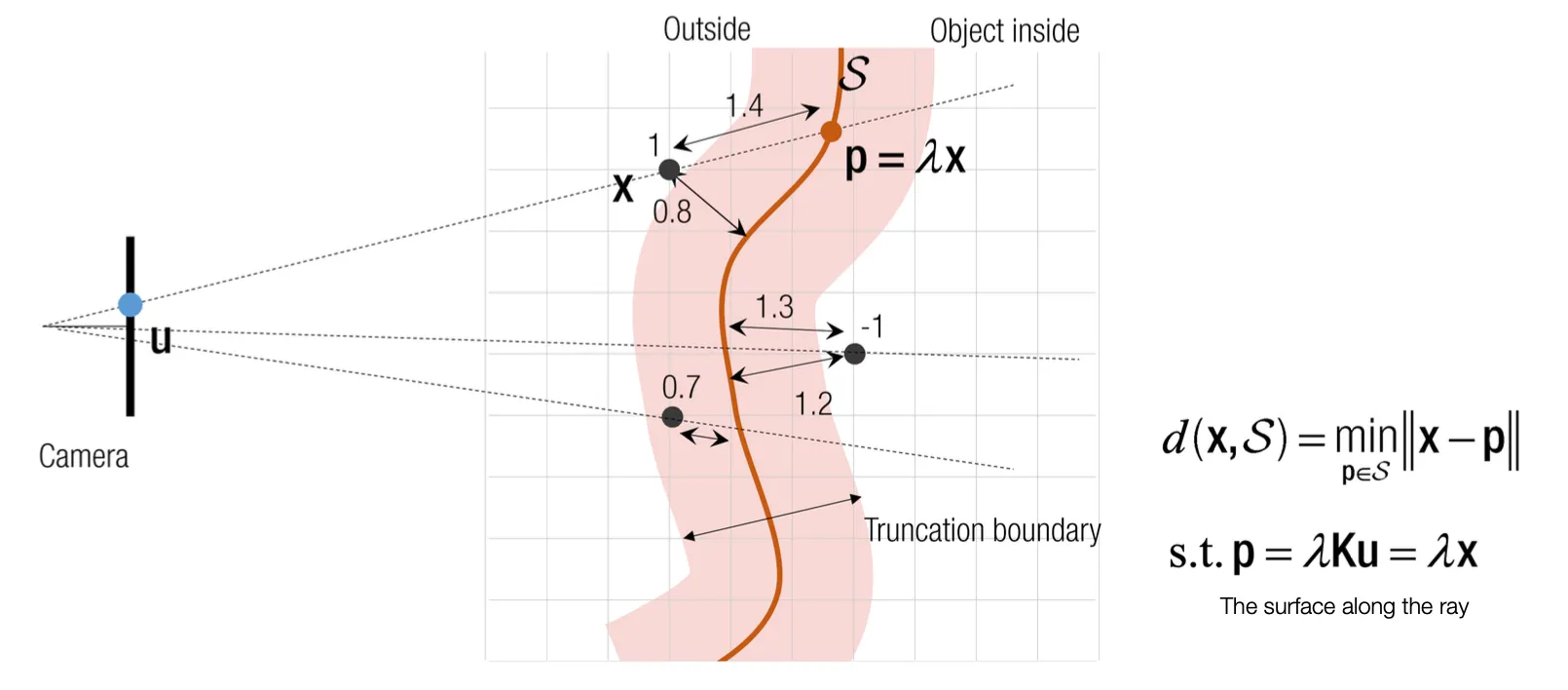 Uncertainty 가 너무 큰, surface 로부터 거리가 먼 곳은 아예 거리를 truncated 하여 Signed Distance Field 를 정의하는 방법론