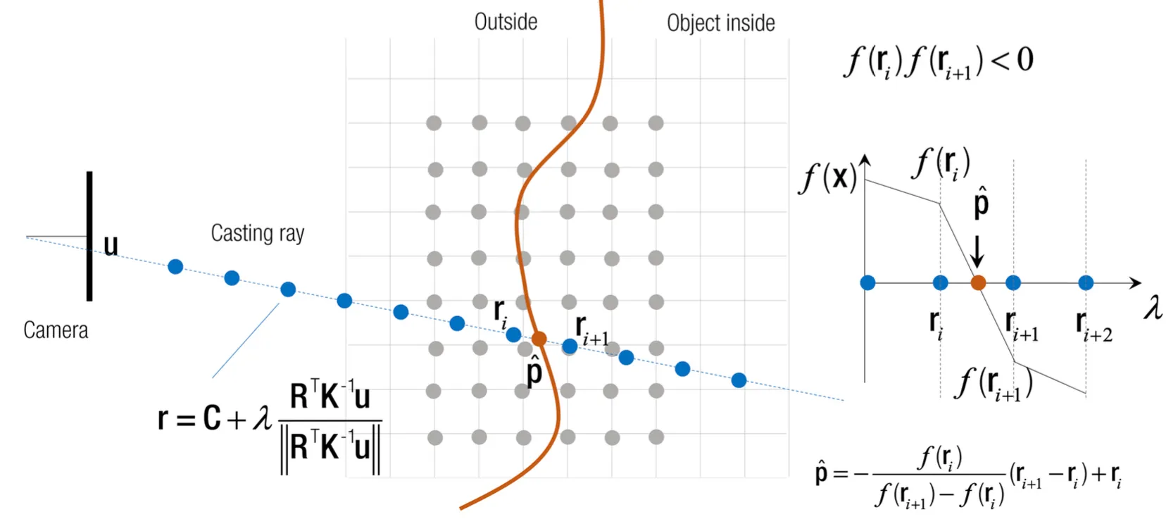 각 ray 상에서 점을 sampling 하여 sampling 된 점마다 Truncated TSDF 값을 구할 수 있고, 해당 값이 양수에서 음수 등으로 부호가 바뀌는 지점에서 interpolation 을 하면 ray 상에서 Truncated TSDF 0 값을 가지는 surface 위치를 구할 수 있음.