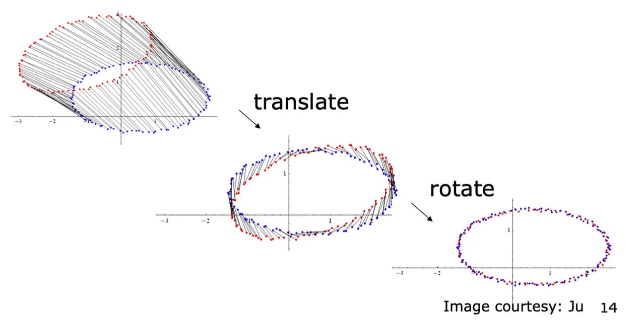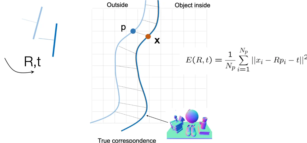 Corresponding Point 를 closest point 로 지정하고 iterative 하게 변환을 적용하거나, ㅜon-linear optimization 을 하면 두 surface 를 붙게 할 수 있는 를 구할 수 있음.