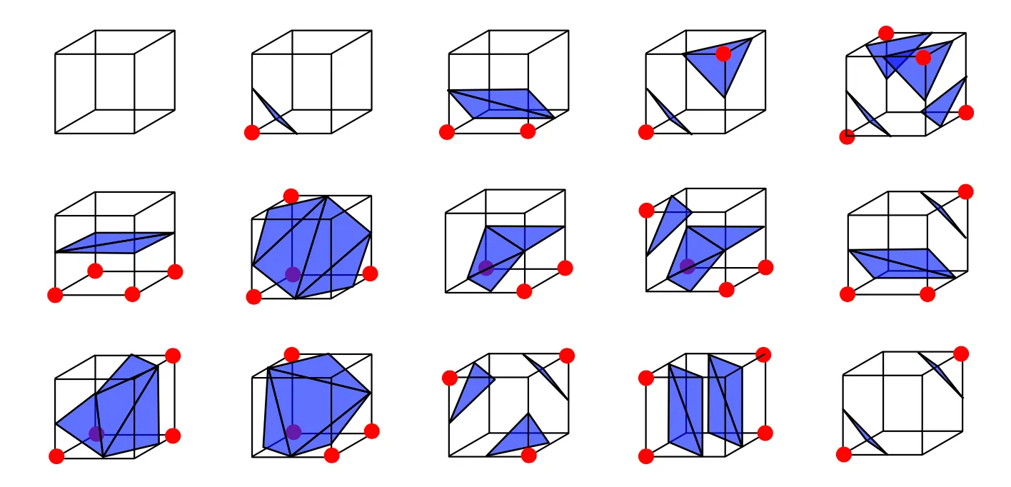 Voxel grid 상에서 TSDF 가 양수, 음수인 조합의 개수가 정해져 있고, 이에 따른 surface 의 형태가 고정되어 있음. (Look-Up-Table)