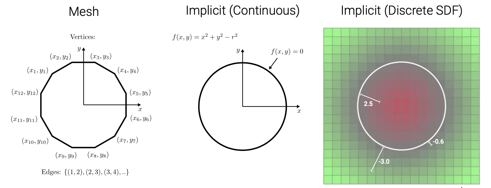 Discritized 한 형태인 Mesh 나 Voxel 과는 다르게 continuous 한 surface 를 가짐.