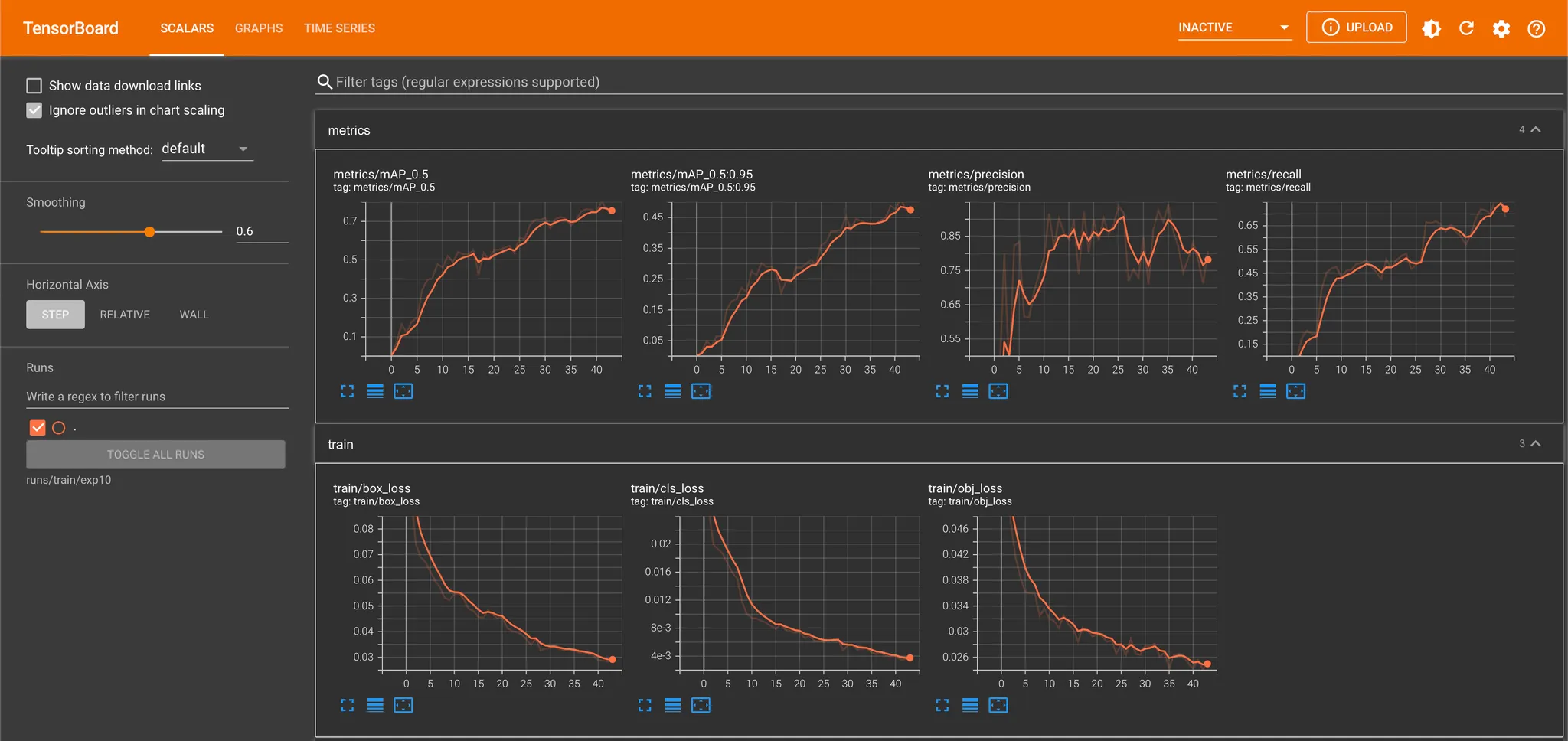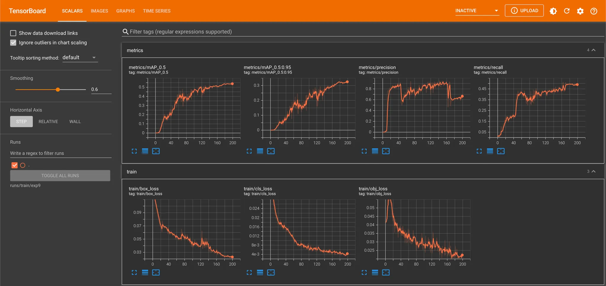 해당 명령어를 통해 학습을 진행해보면서 느낀 것은 데이터셋도 많고 cpu 로 학습을 진행해서인지 학습이 꽤나 느리다는 점이었습니다. 때문에 학습이 잘 되는지 확인하기 위해 tensorboard 를 활용했습니다. 제일 처음에는 training 데이터셋 100 개, validation 데이터셋 100 개로 학습을 진행하여 빠르게 결과를 얻으려고 했는데, 200 epoch 을 돌고 나서 확인해본 결과가 그리 좋지 않았었습니다.