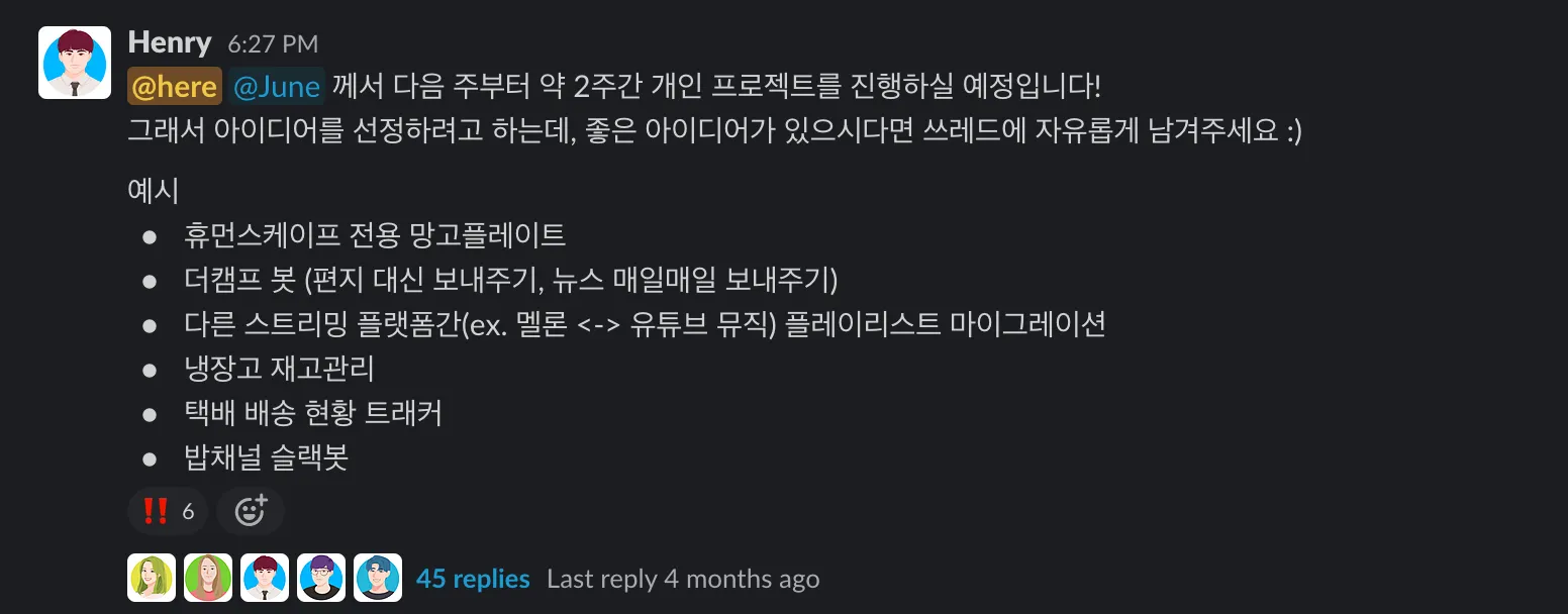 휴먼스케이프 개발직군은 입사 후 일정 기간동안 개개인의 개발 능력을 뽐낼 수 있는 온보딩 프로젝트를 진행합니다. 그 동안 여러 개발자들이 입사하시면서 다양한 온보딩 프로젝트가 선보여졌었는데요! 서비스에 직접 적용할 가능성이 있는 복약 알림 앱, 사내 자산관리 시스템, 회의실 예약 시스템 등 쓸모있으면서도 재미있는 프로젝트들이 많이 개발되었습니다.