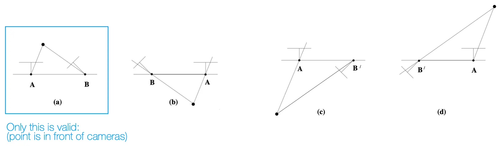 하지만 반대로, 가 주어졌을 때 을 유일하게 결정할 수 없음. 이는 각 Camera Projection Matrix 에 Projective Transformation 를 곱해도 동일한 를 얻을 수 있기 때문임.