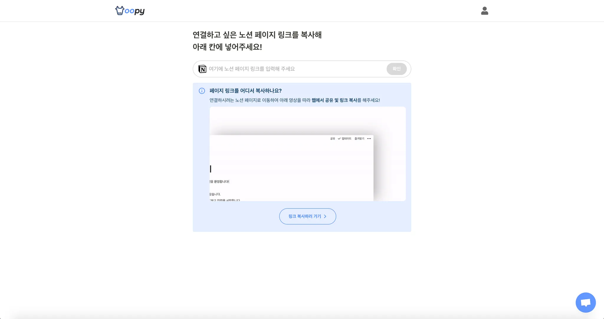 가장 먼저 해야할 것은 oopy 회원가입 및 Notion 과의 연결입니다. oopy 사이트에 접속한 뒤, 하단의 지금 무료로 사용해보세요! 를 클릭하시면 이메일 인증을 요구합니다. 이메일 인증을 완료하시면 아래와 같이 바로 연결하고 싶은 Notion 페이지 링크를 요구합니다.
