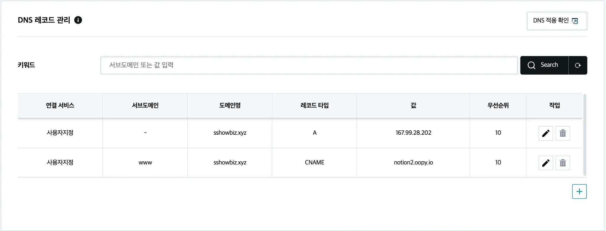 위처럼 CNAME 을 등록할 때 www 를 서브도메인으로, 도메인명에는 구매한 도메인을, 값에는 연결할 도메인 주소 (저희의 경우는 oopy url) 를 적어둡니다. 이렇게 CNAME 을 설정함으로써 도메인 to 도메인으로 매핑을 설정할 수 있고 구매한 도메인으로 접근 시 notion2.oopy.io 도메인과 연결되어 해당 도메인과 연결된 IP 주소에 접근하여 보여줄 수 있는 형태로 설정할 수 있다고 보시면 됩니다.