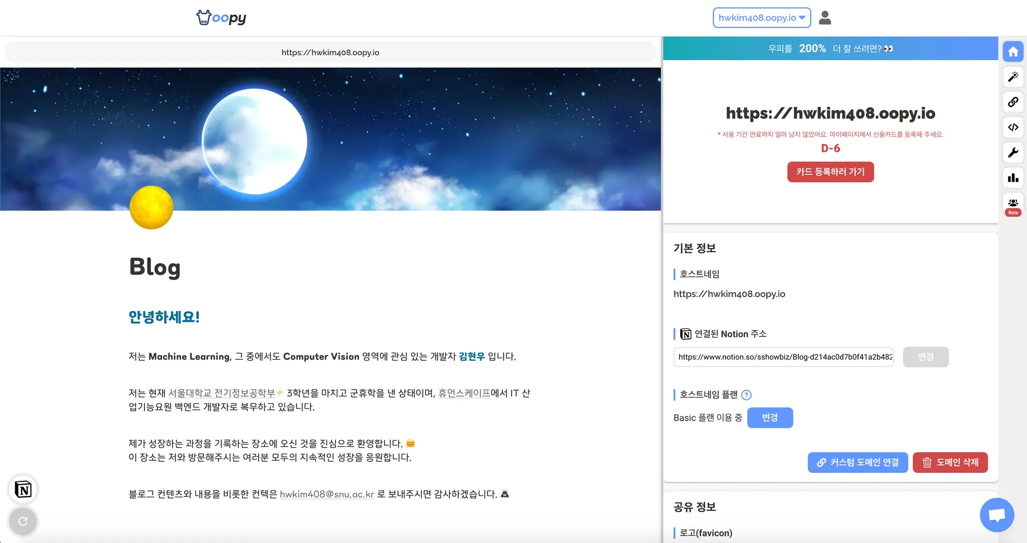 놀랍게도, 여기까지 하시면 Notion 과 oopy 의 연결은 끝입니다! 다만 무료 체험은 6일이고, 그 이후에는 결제를 해야합니다. 좌측 상단의 url 에 접근해보시면 웹사이트가 완성되어 있는 것을 확인하실 수 있으실 거에요!