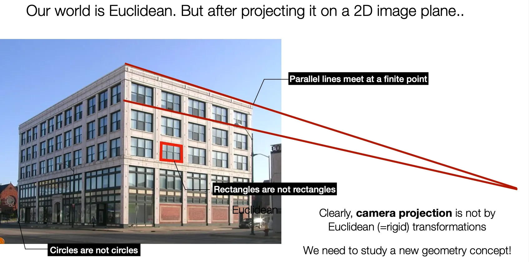 Euclidean Geometry 에서는 “Infinity” 가 정의될 수 없는 큰 단점이 있음!