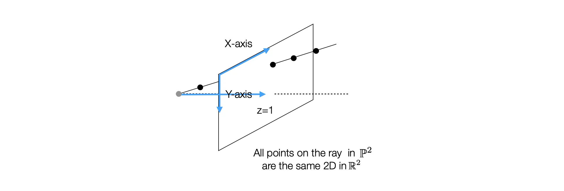 재미있게도, 의 각 항에 를 곱해도 식을 만족하며 (선 위에 있으며), 이는 Homogeneous Coordinate 에서도 비슷하게 보았던 특징임. 당연하게도, 3차원 상의 직선 위의 점들은 2차원 Plane 에 project 시켰을 때 동일한 점으로 간다는 사실을 수식으로도 확인할 수 있는 부분임.