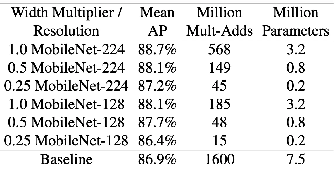 논문에서는 MobileNet 은 object detection 분야에서도 효과적인 base network 가 될 수 있음을 보여줍니다. COCO dataset 을 기반으로, 학습한 MobileNet 은 SSD 300, Faster-RCNN 300, Faster-RCNN 600 의 framework & resolution 에서 다른 모델과 함께 평가됩니다.