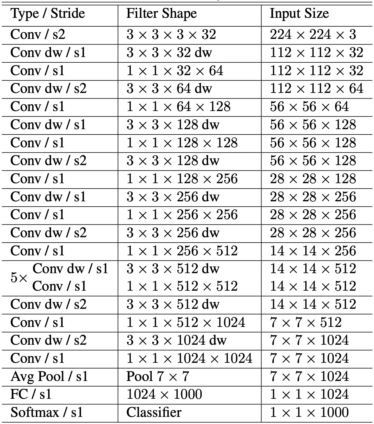 Depthwise Convolution 과 Pointwise Convolution 를 개별 layer 로 취급하여 총 28 개의 layer 가 존재하는 구조입니다.