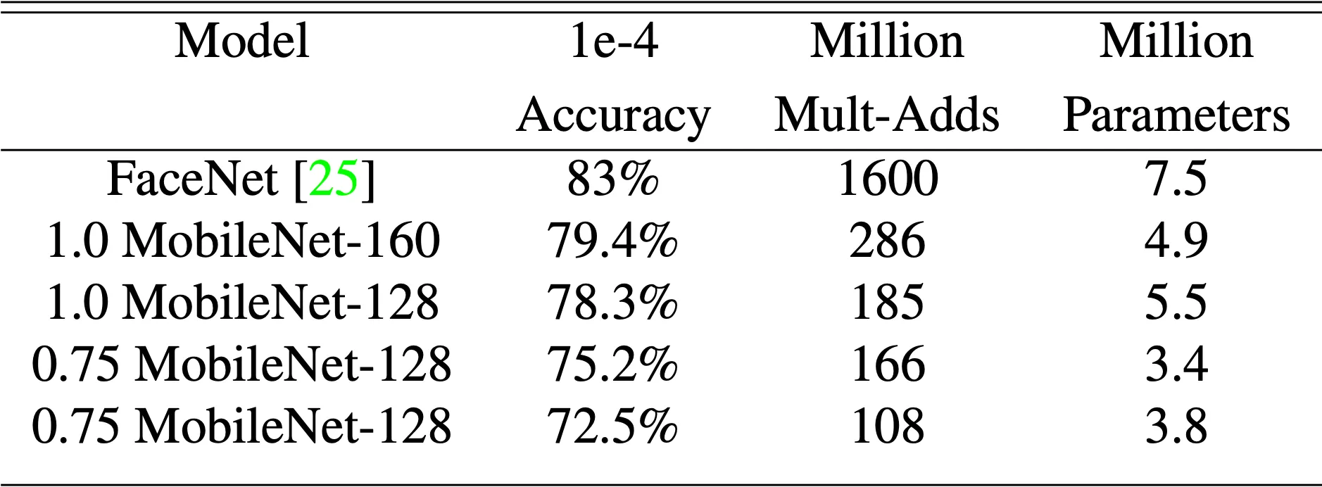 마지막으로, 논문에서는 face recognition 에 특징점이 될 지점들을 추출해 내는 face embedding task 를 MobileNet 에 적용시켜봅니다. Face Attribute 때와 마찬가지로 face embedding 분야의 state of the art 네트워크인 FaceNet 을 기반으로 knowledge distillation 을 진행하였고, 두 네트워크의 output 의 squared error 를 줄이는 방향으로 학습을 진행했습니다.