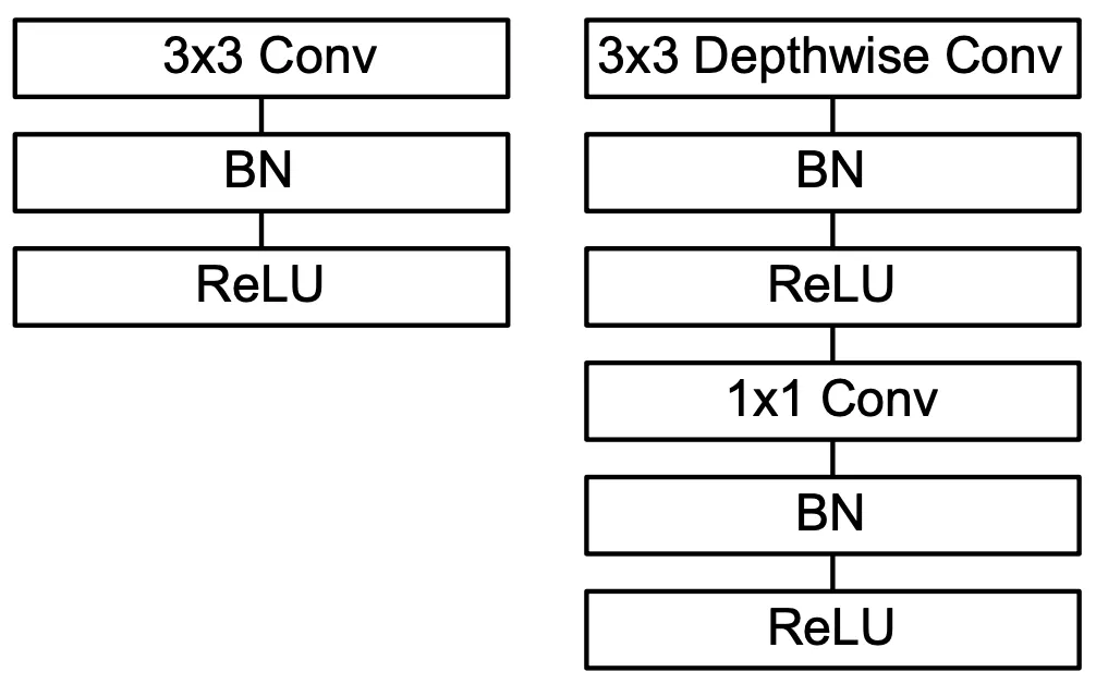 마지막 Fully Connected Layer 를 제외하고는 모든 layer 뒤에 batch normalization layer 와 ReLU activation 이 함께 하는 구조입니다. 위 그림의 우측에 이를 포함한 Standard Convolution 과 Depthwise Seperable Convolution 의 구조가 그려져 있습니다.